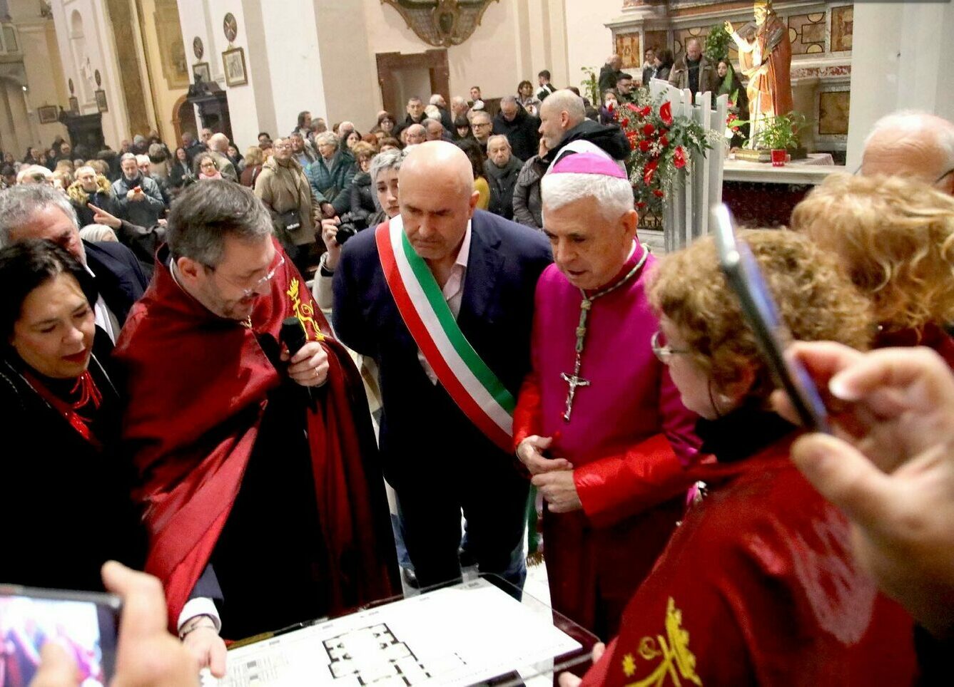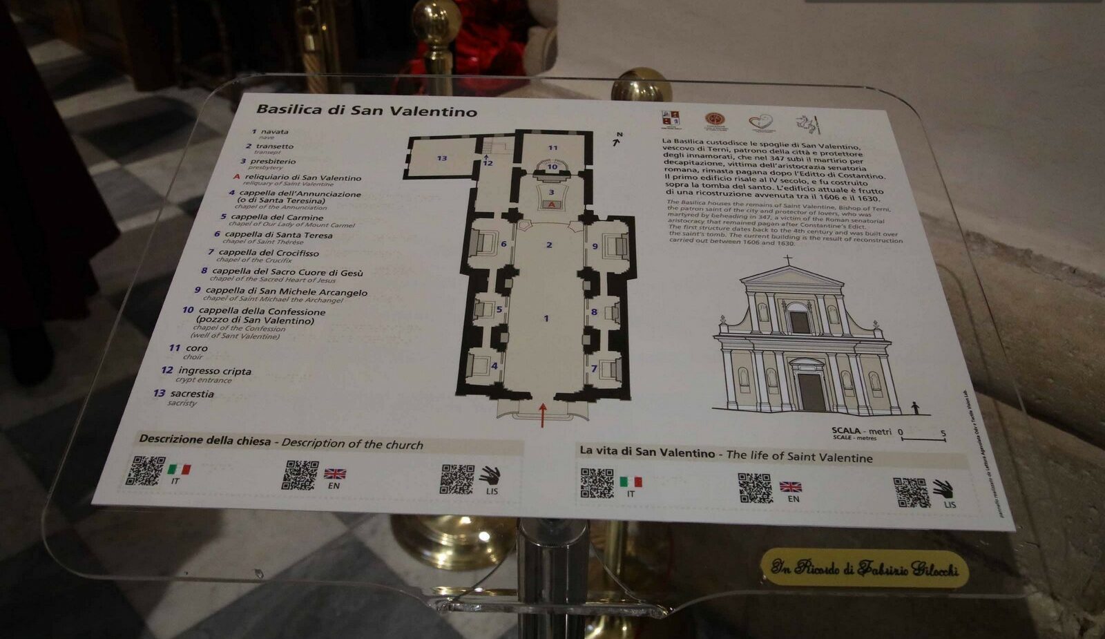 la cui parte centrale sarà occupata dalla piantina della basilica per favorire l’orientamento di chiunque con l’indicazione numerica delle singole parti riportate in legenda. Sarà raffigurato, inoltre, il prospetto della facciata.